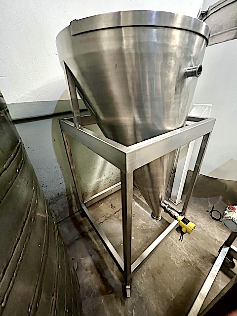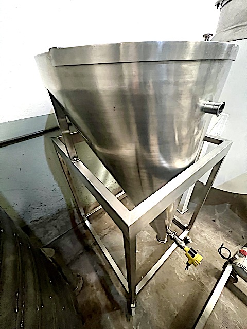 TANQUE CONICO VERTICAL CONSTRUIDO EN ACERO INOXIDABLE CALIDAD AISI 316 FONDO CONICO PARA 250 LITROS DE CAPACIDAD DE CARGA NOMINAL, ALTURA PARTE CONICA 1.220 MM.X 800 MM. DE DIAMETRO MONTADO SOBRE ESTRUCTURA DE (4) RUEDAS DIMENSIONES GENERALES: 940 MM. DE ANCHO X 970 MM. DE LARGO X 1.700 MM. DE ALTURA. DESCARGA DE 50 MM. DE DIAMETRO CON VALVULA, SENSOR DE CAUDAL, TECHO PLANO MEDIA TAPA REBATIBLE.