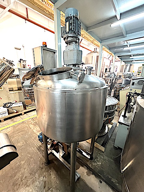TANQUE CILINDRICO VERTICAL CONSTRUIDO EN ACERO INOXIDABLE CALIDAD AISI 316 PARA 350 LITROS DE CAPACIDAD NOMINAL TOTAL, ALTURA PARTE CILINDRICA 560 MM. X 800 MM. DE DIAMETRO ALTURA DE LA PARTE CONICA 500 MM. DE DIAMETRO CON CAMISA DE CALEFACCION / ENFRIAMIENTO, TECHO TORI ESFERICO CON BOCA ENTRADA DE HOMBRE LATERAL DE 430 MM. DE DIAMETRO, MOTOREDUCTOR DE VELOCIDAD DE 2 HP. ANCLA CON RASPADORES DE TEFLON, DESCARGA CON BOMBA A ENGRANAJES PARA LIQUIDOS PESADOS CON MOTOREDUCTOR DE 2 HP. MONTADO SOBRE CUATRO PATAS ALTURA TOTAL 2.430 MM. TABLERO DE CONTROL.