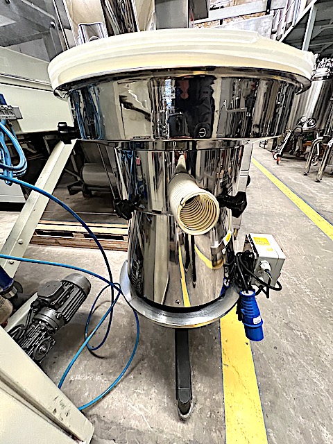 DESEMPOLVADOR DE COMPRIMIDOS Y CAPSULAS MARCA "VPR" CONSTRUIDO INTEGRAMENTE EN ACERO INOXIDABLE DE 420 MM. DE DIAMETRO CON CONTROLADOR VIBRATORIO, MONTADO SOBRE BASE DE TRES RUEDAS, ALTURA TOTAL 900 MM.