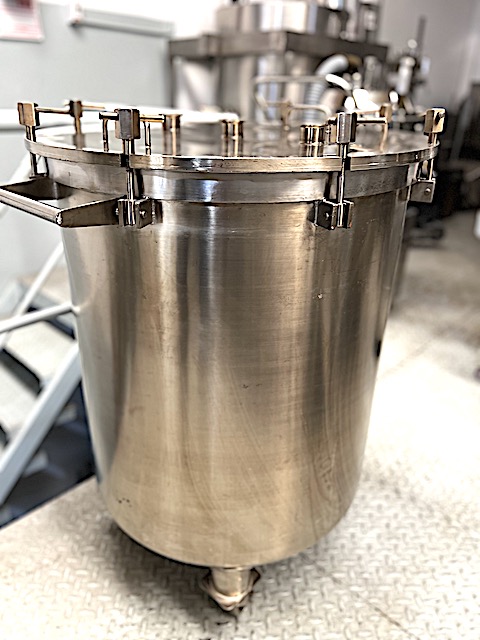 TANQUE DE PRESION CILINDRICO VERTICAL CONSTRUIDO EN ACERO INOXIDABLE CALIDAD AISI 316 PARA 220 LITROS DE CAPACIDAD NOMINAL DE CARGA TOTAL, ALTURA 720 MM. X DIAMETRO DE 660 MM. PRESION 0,5 BAR, TAPA Y FONDO TORI ESFERICOS, DESCARGA CENTRAL INFERIOR DE 2¨DE DIAMETRO, MONTADO SOBRE CUATRO PATAS CON RUEDAS, ALTURA TOTAL 930 MM.