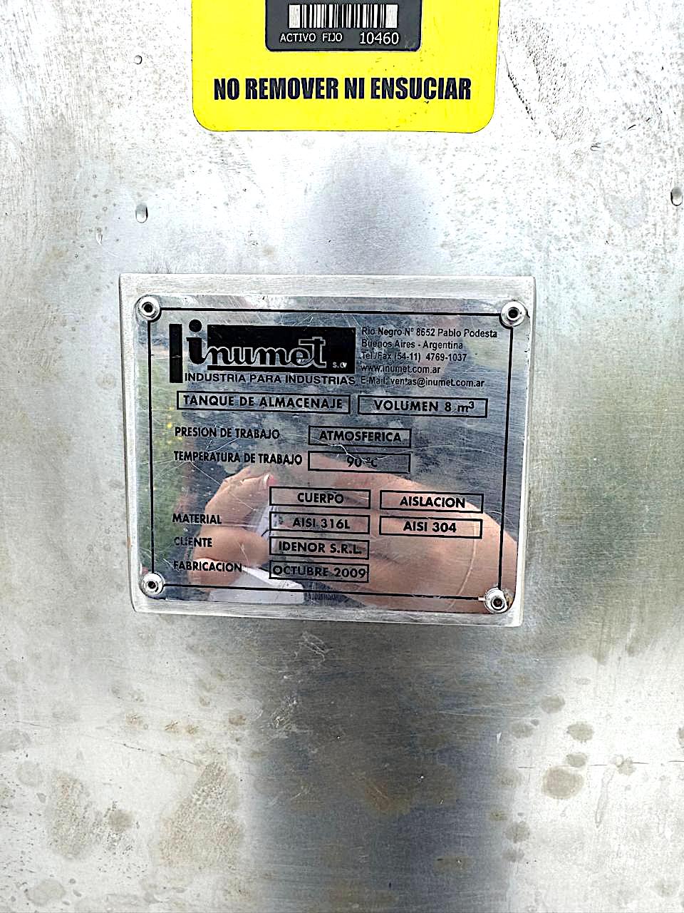 TANQUE CILINDRICO VERTICAL MARCA ¨INUMET¨CONSTRUIDO INTEGRAMENTE EN ACERO INOXIDABLE CALIDAD AISI 316 CON AISLACION TERMICA EN AISI 304 PARA 8.000 LITROS DE CAPACIDAD NOMINAL DE CARGA, DIAMETRO 1.600 MM. X 4.300 MM. DE ALTURA, DESCARGA CENTRAL INFERIOR DE 2¨DE DIAMETRO, BOCA ENTRADA DE HOMBRE LATERAL SUPERIOR DE 500 MM. DE DIAMETRO, MONTADO SOBRE 4 PATAS DE 350 MM. DE ALTURA.