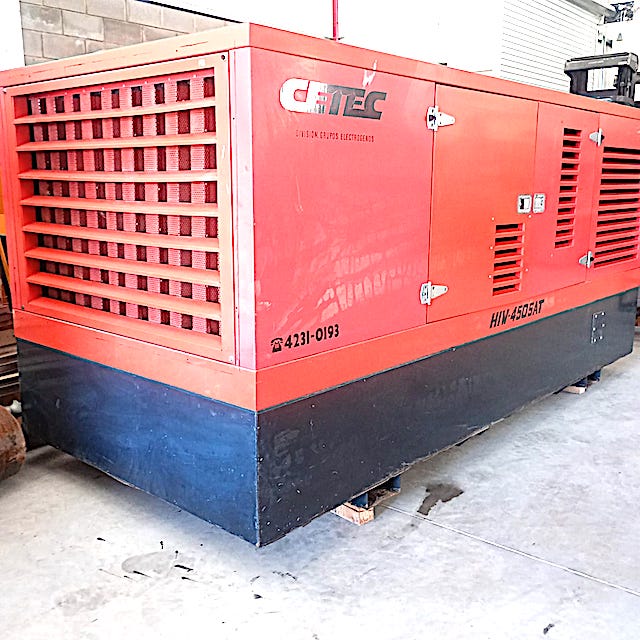 GRUPO ELECTRÓGENO MARCA ¨CETEC¨ MODELO GPO-EST-INS 500 KVA 1.500/G ORIGEN ESPAÑA AÑO 2.001, HORAS DE USO: 20.675 POTENCIA APARENTE 500 KVA, POTENCIA ACTIVA 400 KVA. FRECUENCIA 50 HZ. VELOCIDAD 1.500 RPM. SERVICIO CONTINUO, CORRIENTE 722 A (400 V) 1.255 (230 V) ALTERNADOR MARCA MECC ALTE SPA MODELO ECO 40-2S PESO 5.350 KG. DIMENSIONES: 4.100 MM. DE LARGO X 1.800 MM. DE ANCHO X 2.060 MM. DE ALTURA.