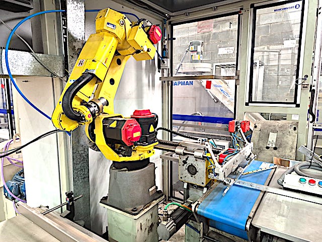 ROBOT ENCAJONADOR MARCA ¨TECNICROM¨ COMPUESTO POR ROBOT MARCA ¨FANUC¨M10 (ADMITE VARIAS CONFIGURACIONES DE FORMATO) ARMADORA DE CAJAS Y CERRADORA DE CAJAS MARCA ¨SIAT¨ ESTE EQUIPO ENCAJONABA TOALLAS FEMENINAS PERO SE PUEDE CONFIGURAR PARA MUCHOS PRODUCTOS.