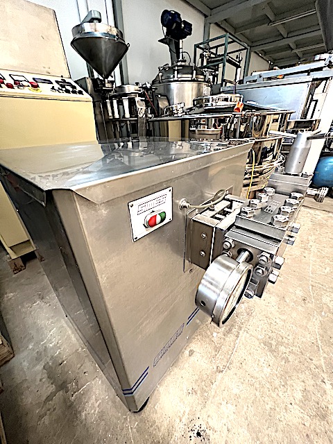 HOMOGEINIZADOR A PISTONES CONSTRUIDO EN ACERO INOXIDABLE MARCA ¨SIMES¨MODELO 2M3, CAPACIDAD NOMINAL EN AGUA 90 LITROS / HORA, MOTOR DE 3 KW. PRESION MAXIMA DE TRABAJO 400 BAR, PRESION ALIMENTACION PRODUCTO 0,5 A 2,5 BAR, TEMPERATURA MAXIMA OPERACIÓN 85 GRADOS, PRESION MAXIMA SALIDA DE PRODUCTO 5 BAR, 3 PISTONES DE 15,8 MM. X 20 MM. DE CARRERA, DIMENSIONES GENERALES: ALTURA 930 MM. X 850 MM. DE LARGO X 800 MM. DE ANCHO, CON MANUAL DEL FABRICANTE.