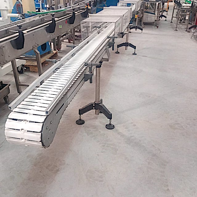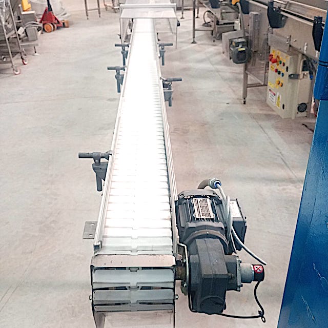 CINTA TRANSPORTADORA RECTA DE CADENA PLASTICA MODULAR, GUIAS LATERALES, MOTOREDUCTOR DE 0.5 HP. DIMENSIONES GENERALES: LARGO 7.800 MM. X ALTURA 920 MM. X 75 MM. ANCHO DE BANDA