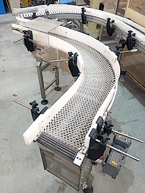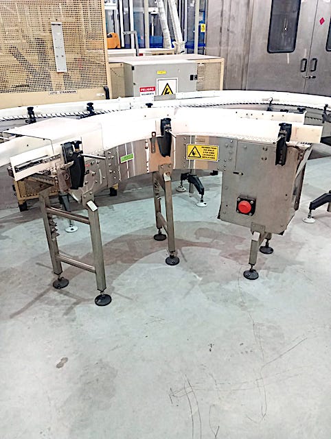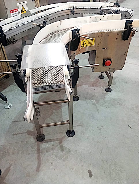 CINTA TRANSPORTADORA CURVA DE CADENA PLASTICA MODULAR, GUIAS LATERALES, MOTOREDUCTOR DE 0.5 HP. DIMENSIONES GENERALES: LARGO 1.800 MM. (DESARROLLO) ALTURA 1.050 MM. X 75 MM. ANCHO DE BANDA 270MM.