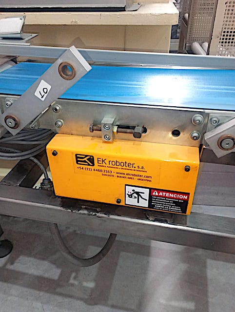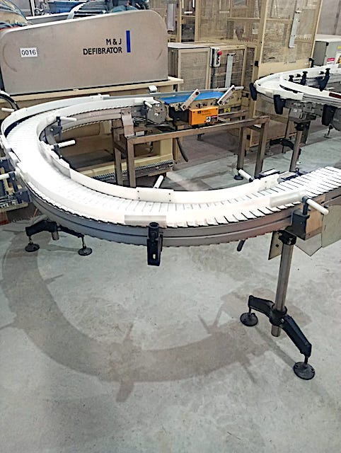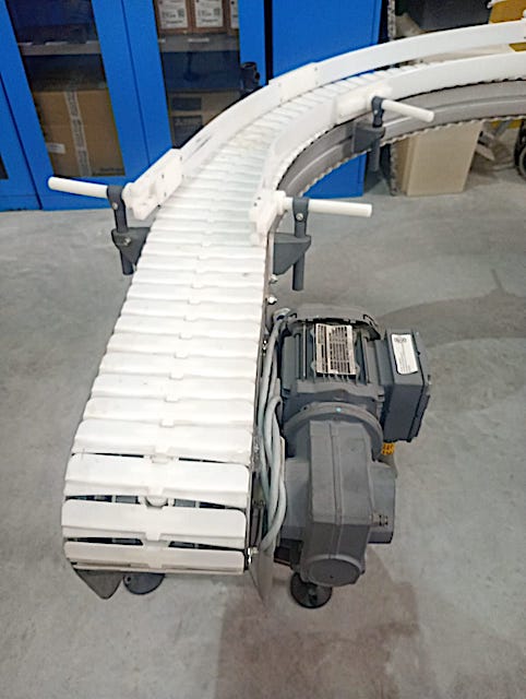CINTA TRANSPORTADORA CURVA DE CADENA PLASTICA MODULAR, GUIAS LATERALES, MOTOREDUCTOR DE 0.5 HP. CON SISTEMA DE PROTECCION MECANICA DEL TRANSPORTADOR MARCA ¨EK ROBOTER¨ DIMENSIONES GENERALES: LARGO 3.600 MM. (DESARROLLO) ALTURA 1.050 MM. X 180 MM. DE ANCHO DE BANDA